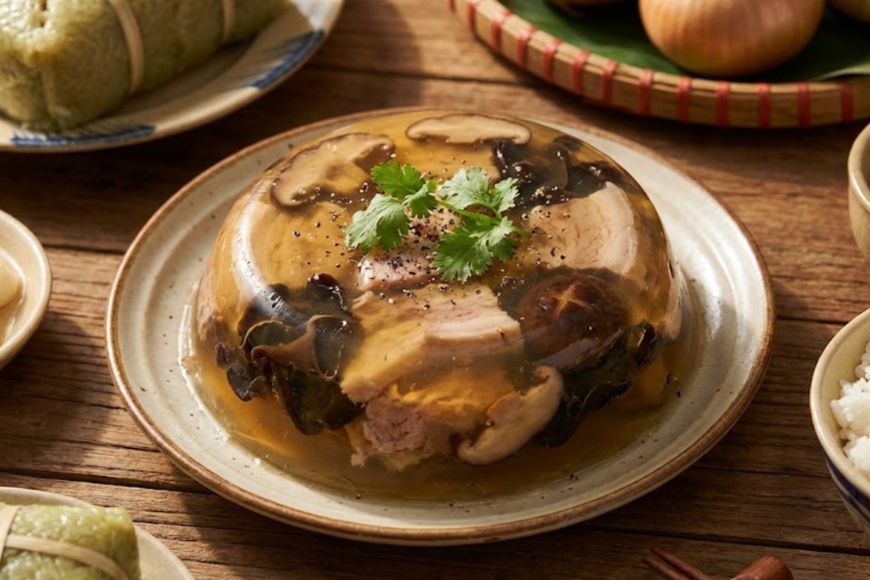 Trong tiết trời se lạnh của miền Bắc, món thịt đông trong veo như pha lê là một điểm nhấn thú vị. Món ăn này thường được ăn kèm với dưa hành muối, tạo nên hương vị hòa quyện giữa béo ngậy và chua thanh.