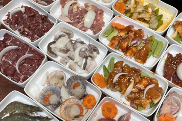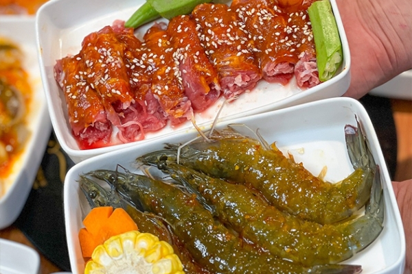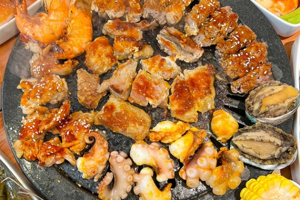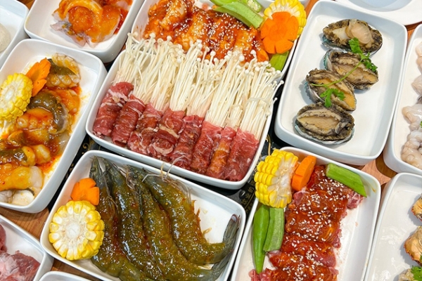 Thực đơn “Buffet nướng & lẩu hải sản bào ngư cao cấp Menu 229K” mang đến hơn 30 món hấp dẫn: tôm, bạch tuộc, mực, nhũ heo, sò điệp, ba chỉ cuộn nấm, bào ngư (giới hạn 2 con/người), steak bò Mỹ, phô mai, tàu hũ ky, gà, cá, chân gà…