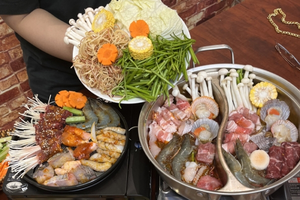 Khách hàng được chọn 2/3 vị nước lẩu: lẩu Thái chua cay, lẩu Tứ Xuyên đậm đà, hoặc lẩu nấm thảo mộc thanh ngọt. Đi kèm nhiều loại nước chấm như tương ớt Hàn Quốc, sốt trứng muối, sốt muối ớt tắc, sate tôm xòe, tương tỏi ớt – giúp hương vị thêm trọn vẹn.