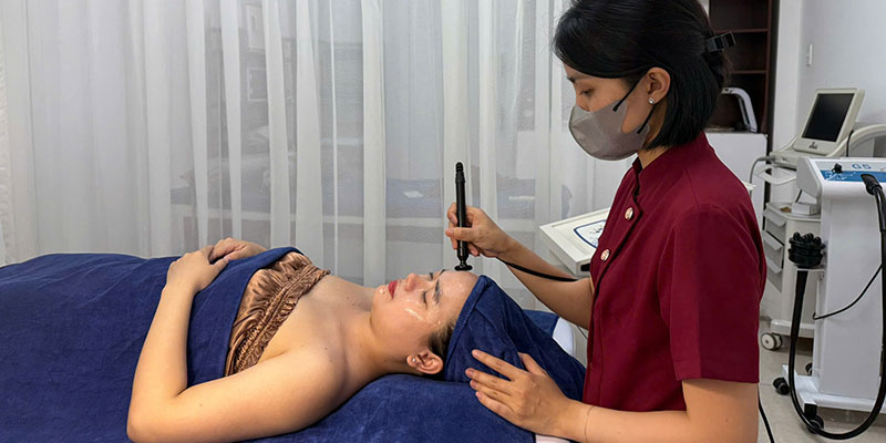 - Bước 10: Đi điện cam tím - ion để sát trùng vết mụn.