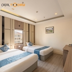 Phòng Family tại Toan Thang Beach Hotel sở hữu diện tích 40m2, thiết kế phù hợp cho các gia đình muốn cùng nhau tận hưởng không gian riêng nhưng vẫn gần gũi. Mỗi phòng đều lắp đặt điều hòa, phòng tắm riêng hiện đại, bàn làm việc cho cha mẹ và khu vực ghế ngồi thư giãn. View thành phố từ phòng giúp bạn lưu giữ khoảnh khắc sống động của Đà Nẵng về đêm. Không gian sáng, sạch sẽ và bố trí hợp lý là điểm cộng lớn.