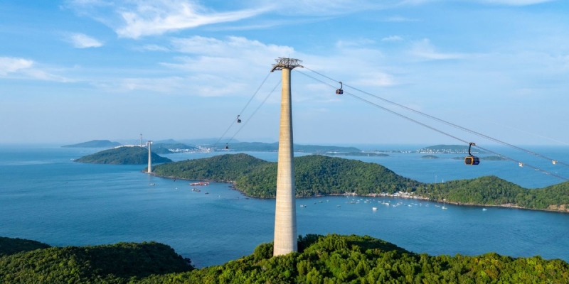 Bắt đầu hành trình của mình bằng một chuyến cáp treo vượt biển dài nhất thế giới – một trong những trải nghiệm không thể bỏ lỡ khi đến Phú Quốc. Tuyến cáp treo Hòn Thơm dài tới 7899,9m, đưa du khách từ ga An Thới đến đảo Hòn Thơm, vượt qua các đảo nhỏ như Hòn Dừa và Hòn Rỏi, tạo nên một hành trình đầy mê hoặc trên không trung.